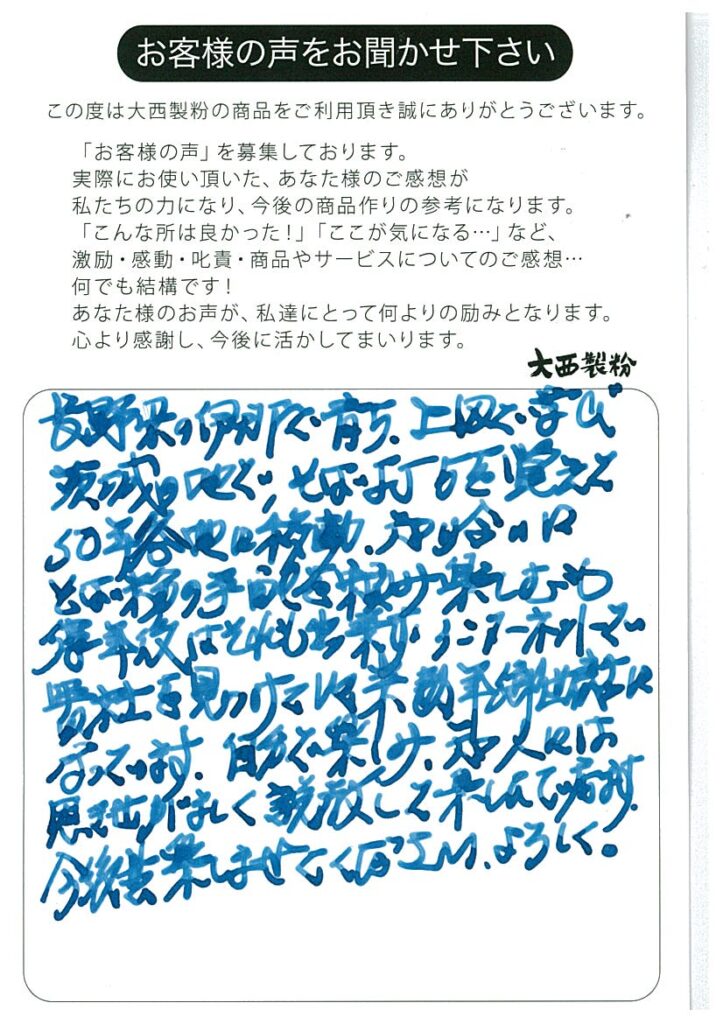 埼玉県 田中さま 73歳 毎月2回10人限定でそば会をしていますが、金印そばが皆様大変好評でした。また打ち易く香りも良く、また使いたいと思います。価格も手ごろと助かります。 お世話になります。蔵の粉屋大西製粉の大西響です。お手紙ありがとうござ... -