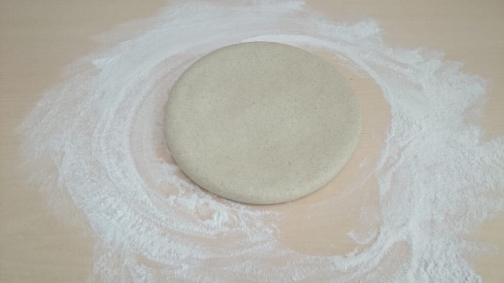信州ひすいそばのそば打ちは、通常の信濃1号に比べて加水量が多く必要であることが多いです。この時はそば粉400gつなぎ粉100gの500gの粉で260gの加水で打ちました。玉にしたときもなかなか表面がしっとりしてこなくて、ぼつぼつとしたあばた上であったので、丁寧に捏ね続けてようやく表面がしっとりとしてきました。