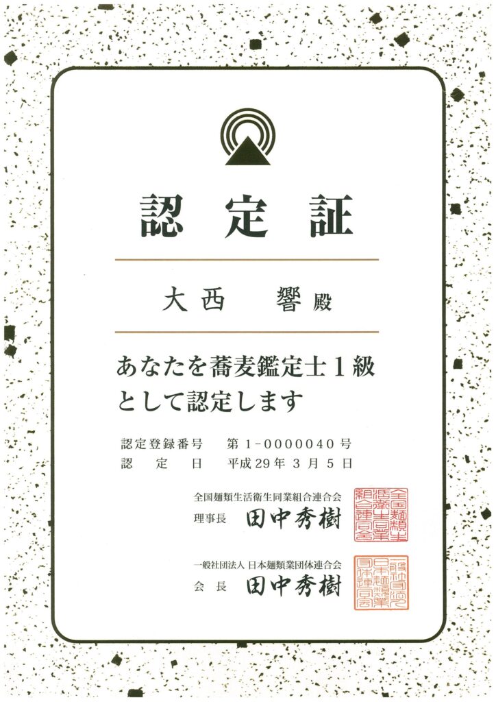 こんにちは蔵の粉屋大西製粉の大西響です。 平成29年3月5日4年の年月をかけて、全国麺類生活衛生同業組合連合会・一般社団法人 日本麺類業団体連合会が主幹する認定制度で、蕎麦鑑定士1級を認定いただきました。 小さな製粉会社で自分の会社の事しかわかり...