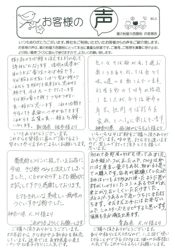 2017年6月12日お世話になります。蔵の粉屋大西製粉の大西響です。お手紙ありがとうございました。最近頂いたお手紙をご紹介いたします。当店のそば粉についてのご感想を頂き、スタッフ一同感謝しております。 「地域に根付いた商をされて感心しております...