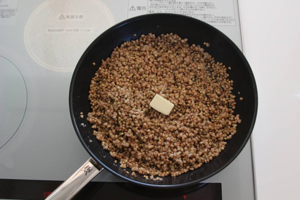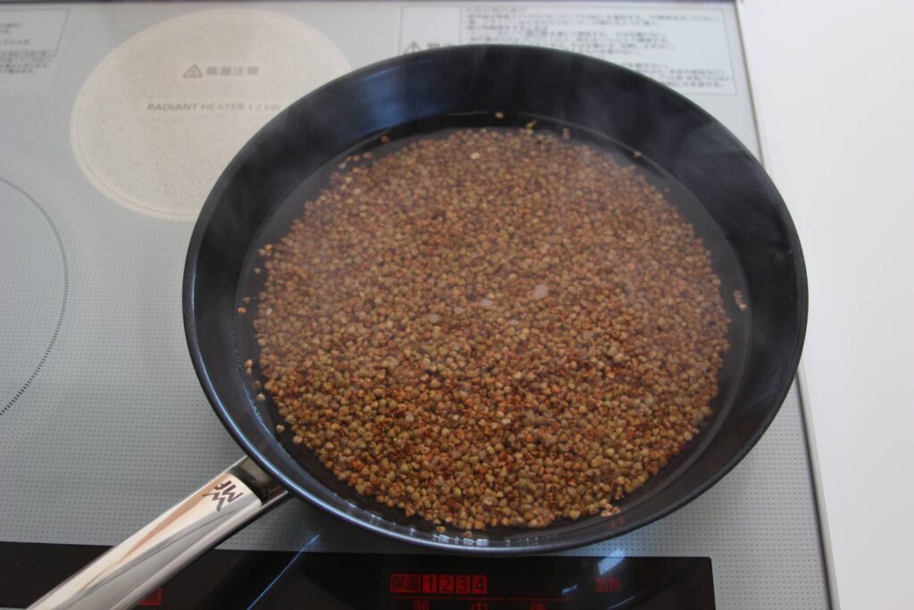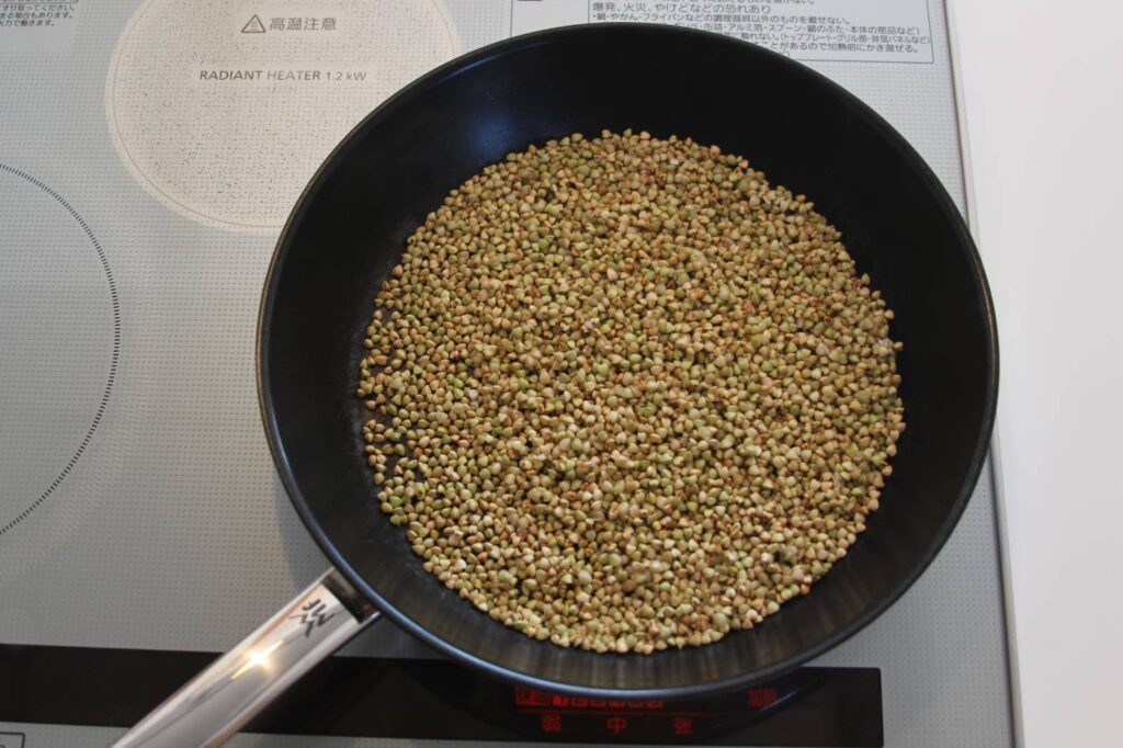 2、フライパンにそばの実を入れ、強火で乾煎りします。パチパチと弾ける音がするまで、煎ります。