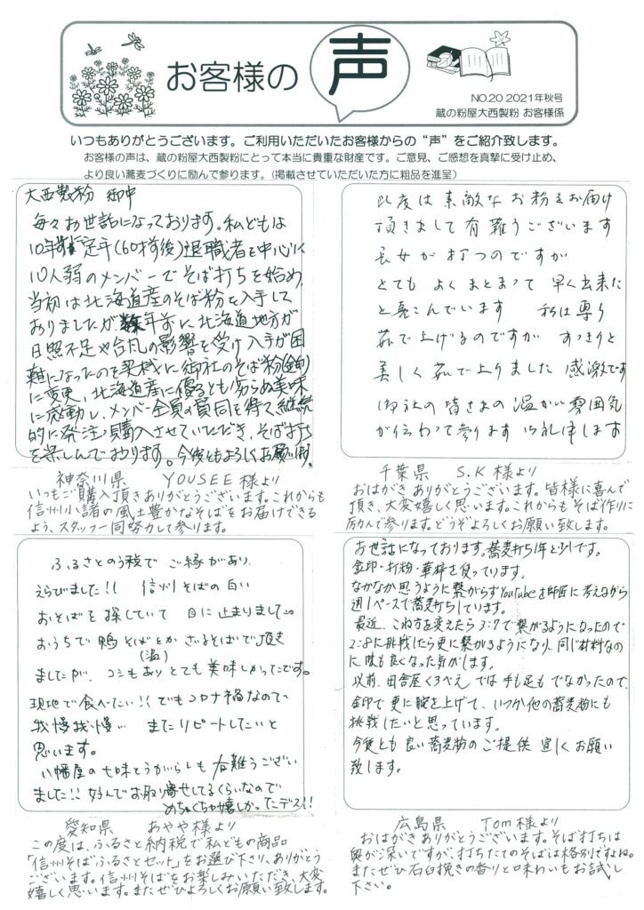 などなど、お葉書を頂きました。今回採用できなかった方も、お送りいただき誠に有難うございます。こうして感想を伝えてもらうことが、私たちのモチベーションに繋がっています。私たちはお客様から頂いた感想を、そばの生産者さまにも伝えてまいります。そうすることでより良い品質の蕎麦ができると思います。何より生産者様たちもうれしいそうです。是非感想をお送りください。コロナ禍でますます旅行レジャーが難しくなってきました。商品と一緒に信州小諸の風景や空気をお届けしていくのも私たちの使命だと感じています。どうぞご自愛ください。