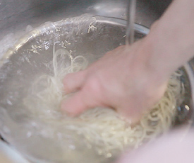 茹でた麺をいったん冷水で粗熱を取り、