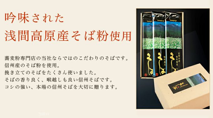 | 商品説明 | ご家庭で食べられる、本格信州蕎麦贈答用です。包装紙ラッピング済み。 紙袋必要の方は通信欄にお書きください。 |